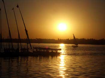 夕刻のナイル川にフルーカ(帆船)の影が美しい光景だった。